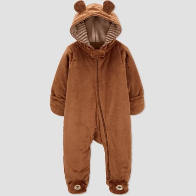 Bring on the cozy! This Carter’s Just One You velboa hooded pram will keep your little one warm and comfortable on chilly Fall days. This brown pram for baby boy features adorable 3D bear ears and bear footart. The top-to-bottom zipper makes it easy to take on and off when you’re on the go. Can you just imagine how cuddly he’ll look sporting this footed 1-piece? This hooded velboa suit makes an excellent gift for new babies too!