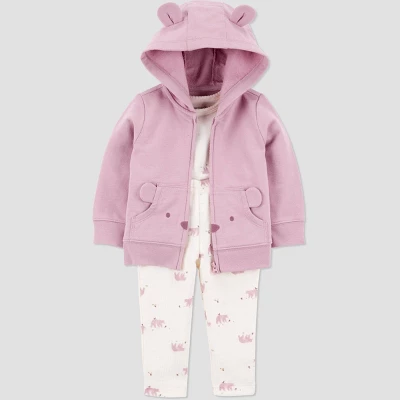 Baby is cozy and stylish in this layered look by Carter’s Just One You. This 3-piece set for baby has everything you need for the changing season – a hooded jacket layered over a short sleeve bodysuit and matching pants with a fun print. Your tiny trendsetter is ready for park playdates, birthday parties, and everything in between. Giving style and convenience, the bodysuit has overlap shoulders for easy dressings and strong snaps at the legs!