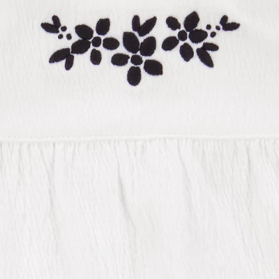 Summer wardrobe loading. This fun 2-piece outfit set for baby girl from Carter’s Just One You features one sleeveless white top with delicate floral embroidery and coordinating shorts. These adorable matching shorts have an allover white geometric print. Just add sandals and she’s ready to go. Dress her up in this sunny weather look for parties, playdates, and anything in between. This 2-piece summer outfit for baby girl makes a great gift too!